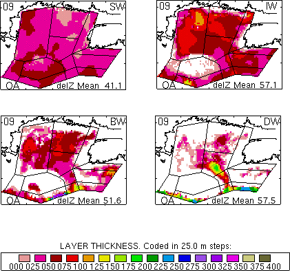 Figure 1. September AFAP climatology of Gulf of Maine surface (SW), intermediate (IW), bottom (BW) and deep (DW) density layer extents and thicknesses, determined using Objective Analysis techniques.