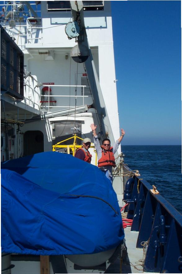 We were nineteen intrepid scientists. We had interests in water column hydrography, nutrients, plankton, birds, and marine mammals. We were the plankton team and the upper trophics team (birds and mammals) of the GLOBEC Northeast Pacific (NEP) process study in the California Current System (CCS). Our home for 17 days was to be the RV New Horizon. Our colleagues would be joining us in the CCS on two other vessels: the RV Wecoma and the FV Sea Eagle. RV stands for 'Research Vessel'. Both the New Horizon and the Wecoma are UNOLS supported research vessels. The New Horizon is operated by Scripps (UCSD); the Wecoma is operated by Oregon State University. The FV stands for 'Fishing Vessel' - the Sea Eagle is a private, commercial trawler, that was chartered by GLOBEC to conduct fish sampling.