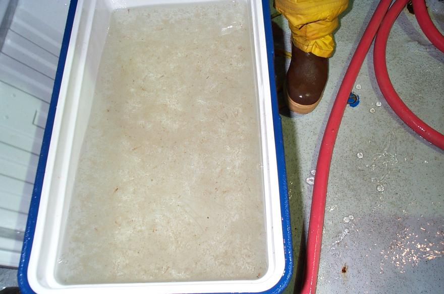 We towed a large ring net for short periods and slowly to collect animals for experiments looking at molting rate and egg production rate. The contents of the cod end were dumped into coolers and then sorted into individual containers for the experiments.