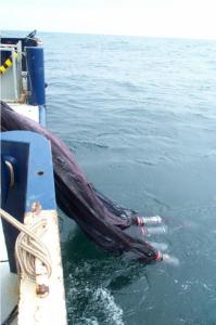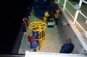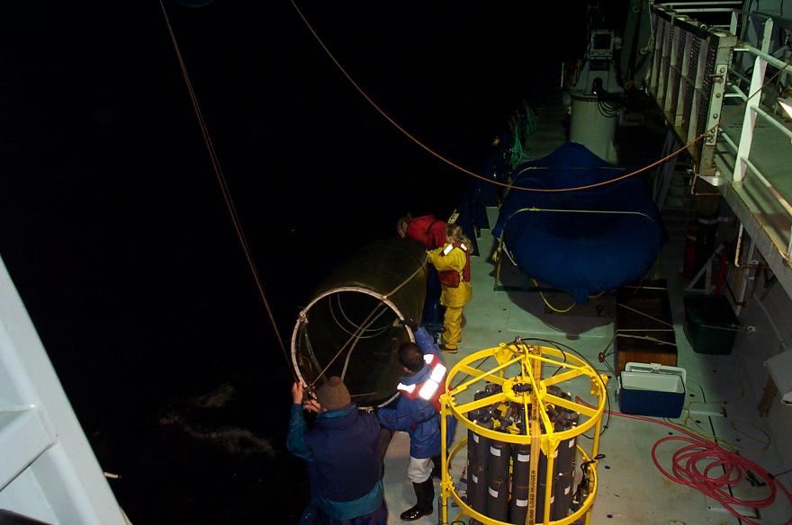 MOC DeploymentPrior to lifting the MOC off the deck, the cod-ends are tossed into the water in an orderly fashion--to avoid tangles in the nets.