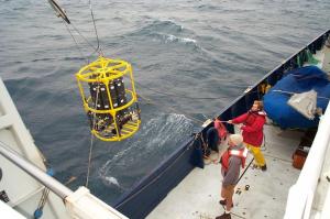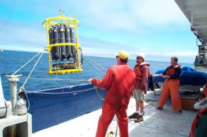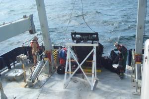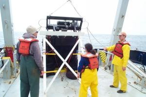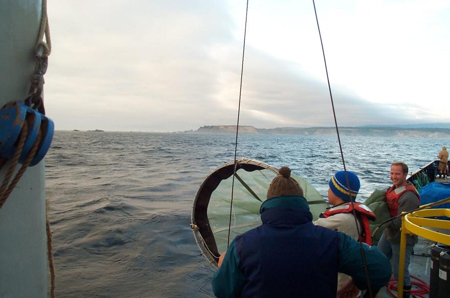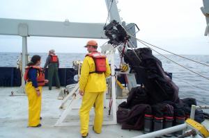 For the plankton team, our primary goal on this research cruise were to document the distribution of zooplankton, in particular the euphausiids and larger copepods, in relation to the physical structure of the coastal ocean (extending out about 100 miles from shore), including vertical (thermocline) and horizontal (fronts) variability. We did this by sampling the physics and biology of the ocean. Description of the physical structure of the ocean was primarily a task for the physical group on the RV Wecoma, but we deployed CTDs (Conductivity-Temperature-Depth) to measure water column properties. The CTD was equipped with a rosette water sampler to obtain in situ water for measuring extracted chlorophyll and nutrient concentrations. Water sampling was needed to support the physical observations being made by the Wecoma, since their package did not collect water. Biological sampling was accomplished using a MOCNESS (see below) and smaller plankton nets.