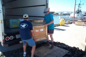 Jay Peterson (Univ. Minn.) flew in early and helped unload the truck and move gear on board. Here, Jay sees to the loading of the bongo frame. The bongo was a spare in case some of the primary equipment failed. We didn't use it. The crane was operated by Shad Baiz, one of the Resident Marine Technicians from Scripps.