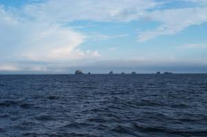 Viewing conditions were not often as ideal as shown here--flat seas, clear sky, little haze, sunny and warm. More commonly, times of flat seas were times of fog, either limiting visibility or requiring evacuation of the flying bridge so that the radar could be used. Conversely, clear days were often windy and with high sea state, which rolled and moved the ship vertically, making sightings of whales difficult.
