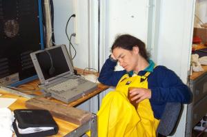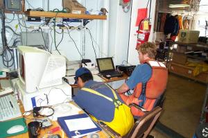 After the gear is transferred to the ship, the interior lab spaces must be set up, and everything stowed and secured. The entire science party is involved in this. The sooner we secure everything, the sooner we can depart. On this cruise the scientific teams consisted of: