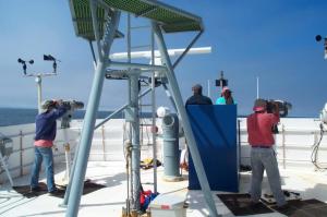 When they were not filtering samples in the lab, the mammal team (shown at right (left to right)) of Greg, Todd, Cyndy, and Mike would watch through binoculars and 'BigEyes'. The BigEyes were binocular scopes with approx. 30X magnification, which in clear conditions allowed the observers to see and identify mammals (and birds sometimes) as much as 8-10 miles from the ship. The observers would rotate through the two scopes and binocular positions frequently to avoid fatigue. The sighting platform was located above the bridge (on the 'flying bridge'). Mammal (and bird) observing was done only while the ship was underway to avoid the ship attraction effect.