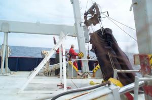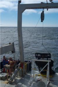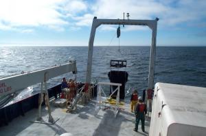 The A-Frame and winch are used to lift the MOCNESS over the side, while steadied by tag lines. The lines are released and the MOC is lowered to its maximum depth.