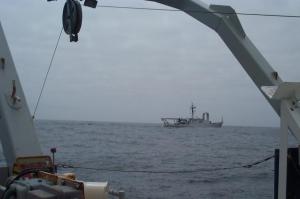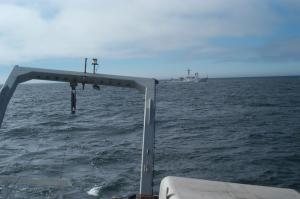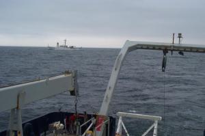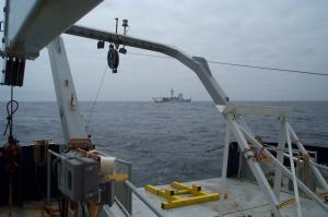 The RV Wecoma was towing an acoustics instrument that measured the intensity of backscatter from different sized scatterers in the water column. One of our goals during this three ship operation was to have the three ships together multiple times so that New Horizon MOC could sample discrete depths of high scattering observed by the acoustics package on the Wecoma. Also, we were interested in obtaining descriptions of the plankton abundances and types nearby the regions that the FV Sea Eagle was capturing juvenile salmon. We managed to deploy the MOCNESS several times during the cruise while the Wecoma was nearby (see photos), although it is to early to provide results of the acoustics-in water comparison.