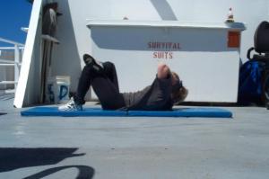 Our study region was the coastal waters off Northern California and central and southern Oregon--basically from Crescent City, CA to Newport, OR. Redwood City to Crescent City is about 40 hours at the ships cruising speed of 10 kts, if the weather was favorable. The weather was pleasant during the trip north, leaving time for diverse activities. Here Julie (OSU) keeps in shape, while Bill recreates a little less strenuously. David (shown here) and Larry used the time to work on manuscripts and data they had collected previously.