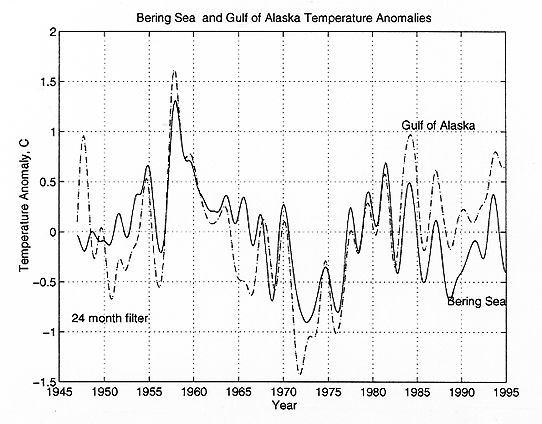 Figure 11. Sea surface temperature anomalies for the Bering Sea (55¡N, 170¡W) and the Gulf of Alaska (55¡N, 160¡W) with 24 month filter. Data are from Dan Cayan, Scripps Institution of Oceanography, La Jolla, CA.