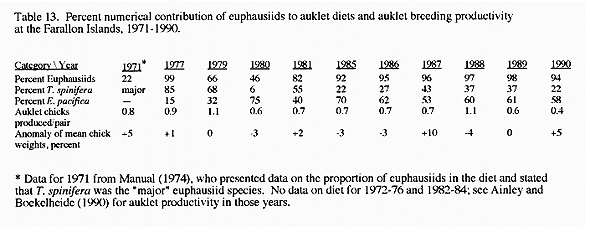 * Data for 1971 from Manual (1974), who presented data on the proportion of euphausiids in the diet and stated that T. spinifera was the "major" euphausiid species. No data on diet for 1972-76 and 1982-84; see Ainley and Boekelheide (1990) for auklet productivity in those years.