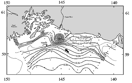 Figure 13. Geopotential topography (ĘD, dyn m) of the sea surface (1/100 db) during September 1976 on the shelf outside of Prince William Sound, Alaska. The 183 m and 1830 m depth contours are shown as broken lines. Arrow denotes direction of flow. (Redrawn from Reed and Schumacher, 1986).