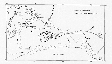 Figure 15. Trajectory of satellite-tracked drifting buoy released in the Gulf of Alaska in summer 1976. Note the generally along-coast flow east of Kayak Island, the eddy west of Kayak Island, and the movement of the drifter across the shelf and into Prince William Sound. (from OCSEAP Staff 1986).